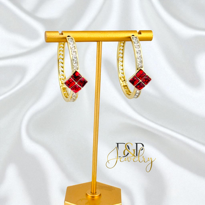 14K GOLD/LONG SIZE RED STONE DESIGN HOOP EARRING HP805