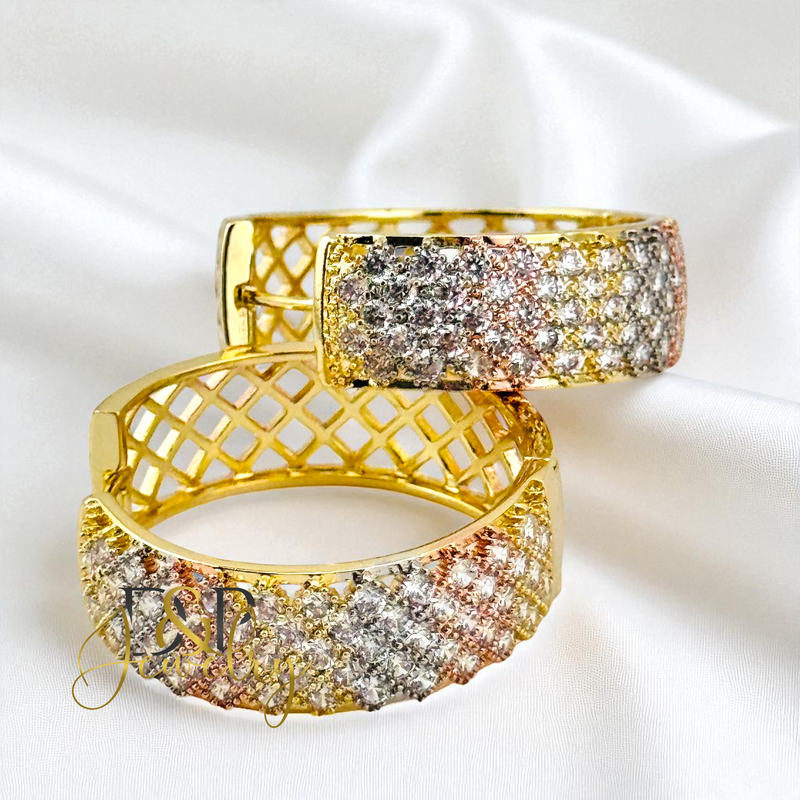 14K GOLD/WHITE STONE FASHION MEDIUM  HOOP EARRING HP749