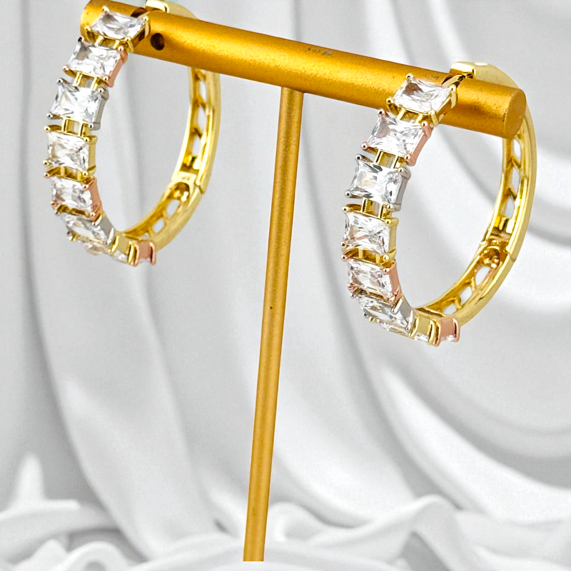 14K TRICOLOR WHITE STONE LONG  HOOP EARRING HP750