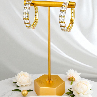 14K TRICOLOR WHITE STONE LONG HOOP EARRING HP750