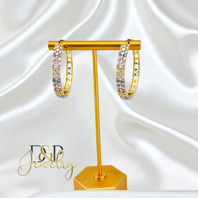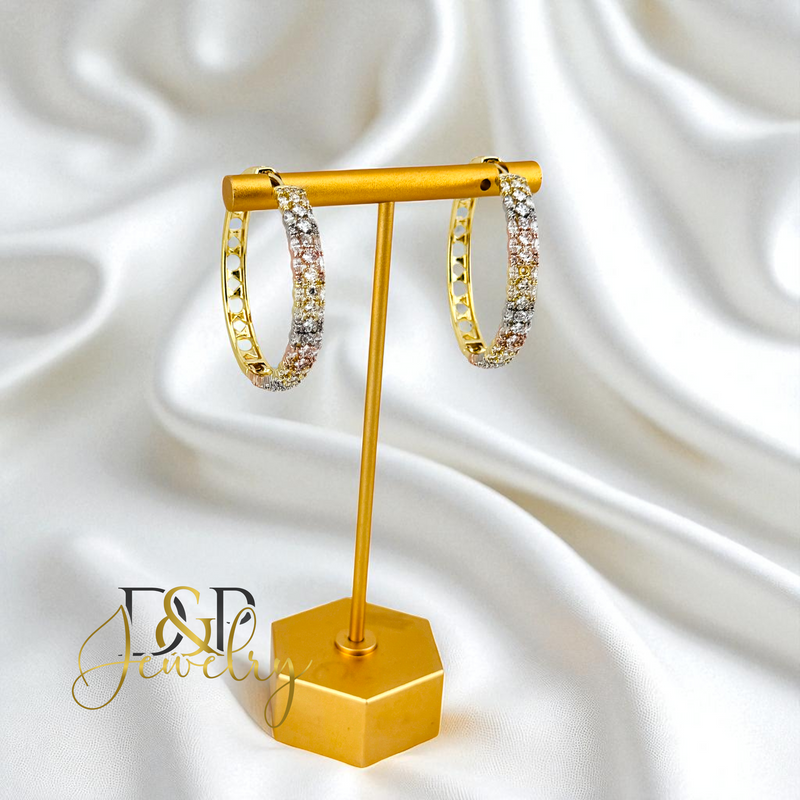 14K TRICOLOR WHITE STONE LONG HOOP EARRING HP751