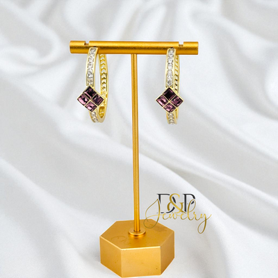 14K GOLD/LONG SIZE PURPLE STONE DESIGN HOOP EARRING HP804